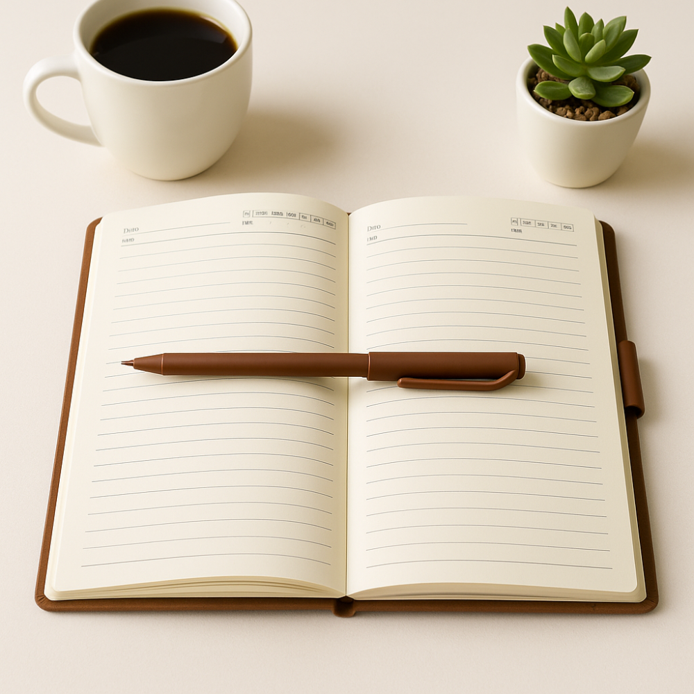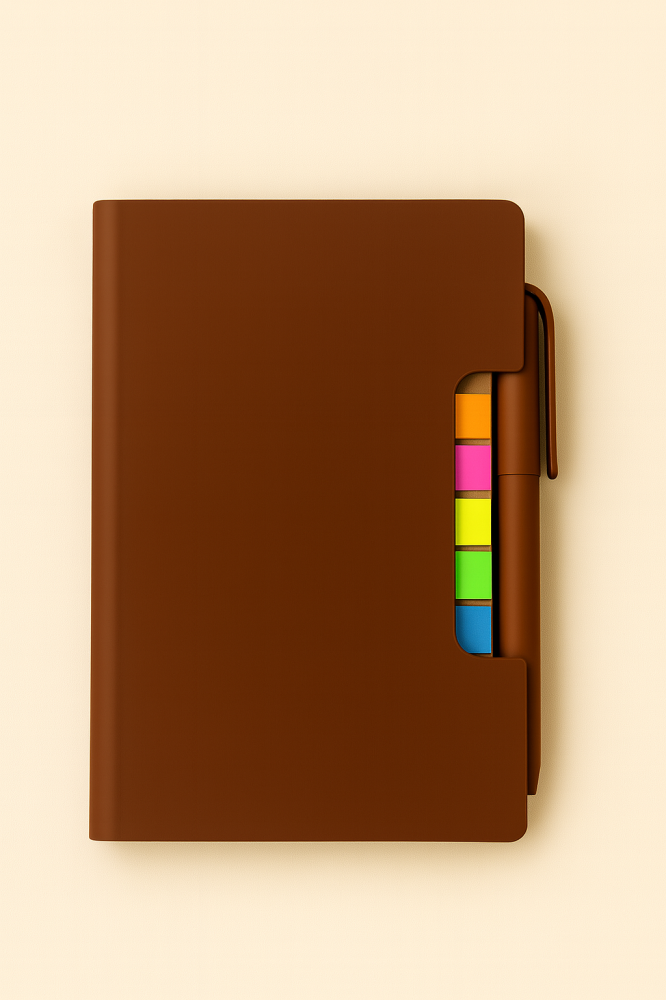 دفتر ملاحظات عملي باللون البني الأنيق مع قلم مدمج وفواصل ملونة تساعدك على تنظيم أفكارك ومهامك اليومية بسهولة. مثالي للطلاب، المكاتب، وأصحاب الأعمال الباحثين عن وسيلة أنيقة ومرتبة لتدوين الملاحظات.