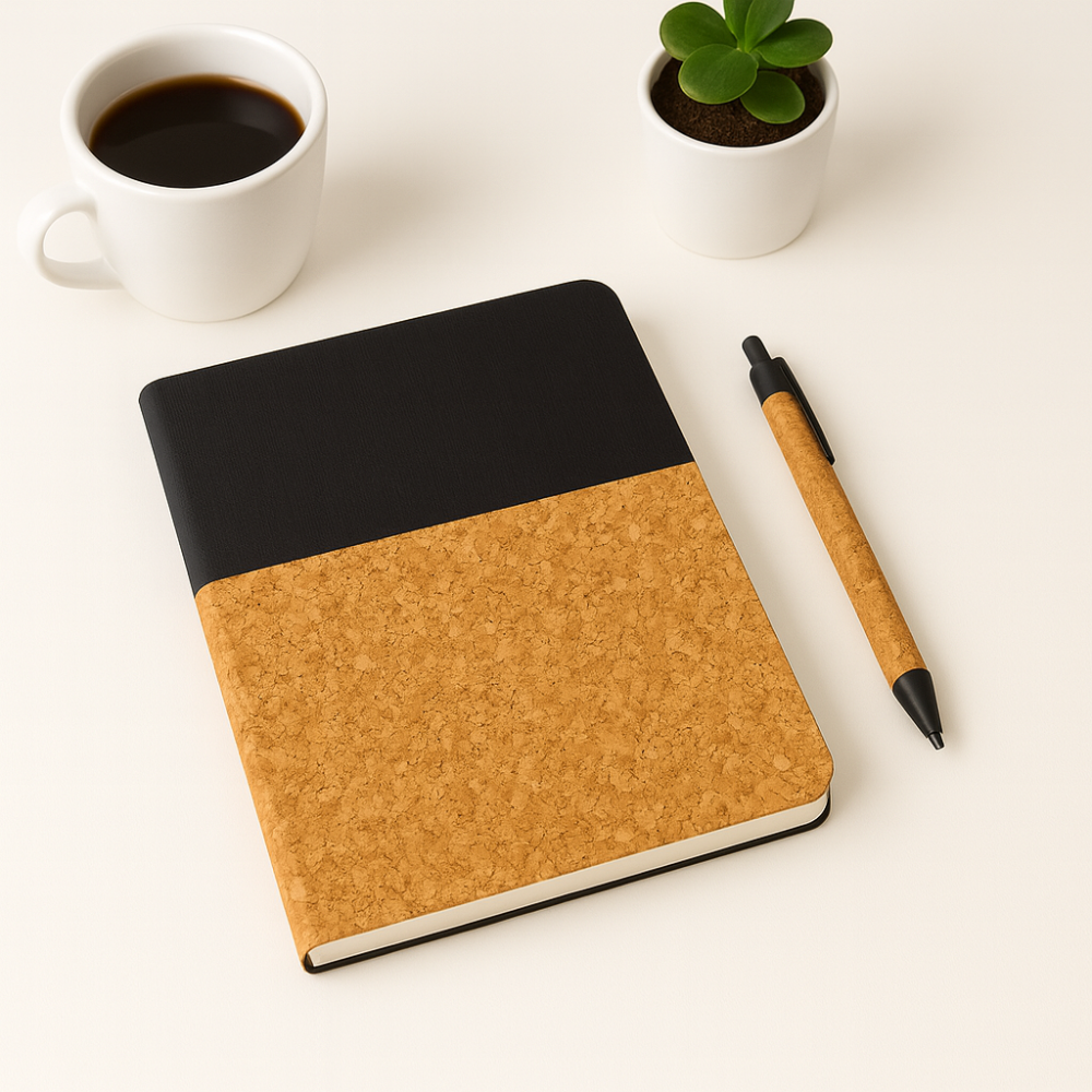 A stylish notebook combining natural brown cork with classic black, paired with a matching eco pen. Its elegant design adds a professional touch to your desk or bag, making it perfect for daily notes at work, school, or meetings.