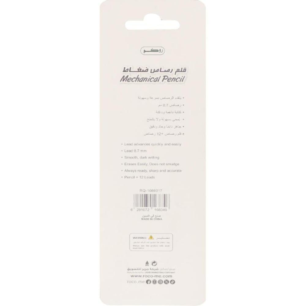 ROCO Mechanical Pencil with a comfortable metal grip, includes a refill pack of 12 leads (0.7mm, HB2). Smooth, dark writing, erases easily without smudging. Ideal for daily use and studying.